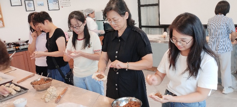 活动前,学院工会特地为大家精心准备好面团、馅料、手套等材料。在老师的讲解演示下,大家迫不及待开始动手制作,擀皮、加馅、包月饼,现场气氛温馨热闹。谁懂,把油酥皮擀成葱油饼的尴尬?谁懂,咸甜月饼混在一起,月饼品尝出了开盲盒的快感!把尴尬、失误与快乐一起包在月饼里,一口下去,满满的幸福感。