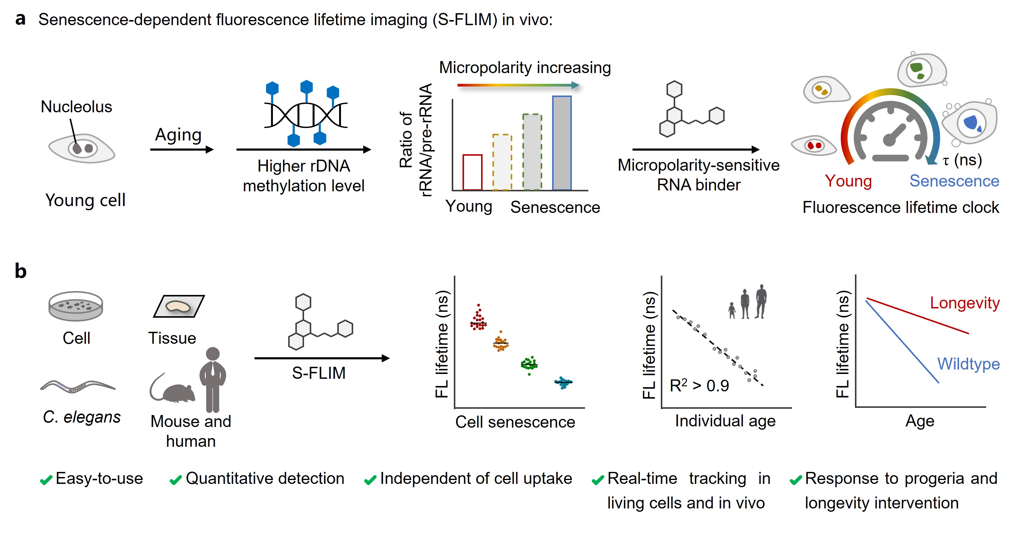 近日,国际顶级学术期刊 Nature Aging 以“Fluorescence lifetime clocks quantify senescence and aging”为题,在线报道了我校化学与分子工程学院郭志前教授、朱为宏院士团队在化学、生物学和分子影像交叉领域取得的重要突破。该研究创新提出“自上而下”的衰老量化研究策略,建立基于荧光寿命成像的衰老检测(S-FLIM)新方法,通过分子工程化杂交发展新型黄菁类染料,成功构建超敏分子探针“荧光寿命衰老时钟”(Fluorescence Lifetime Aging Clock),实现从细胞到生物个体衰老进程的动态检测与长寿个体鉴定,为衰老生物学研究和抗衰老干预研究提供可视化的新型技术手段。