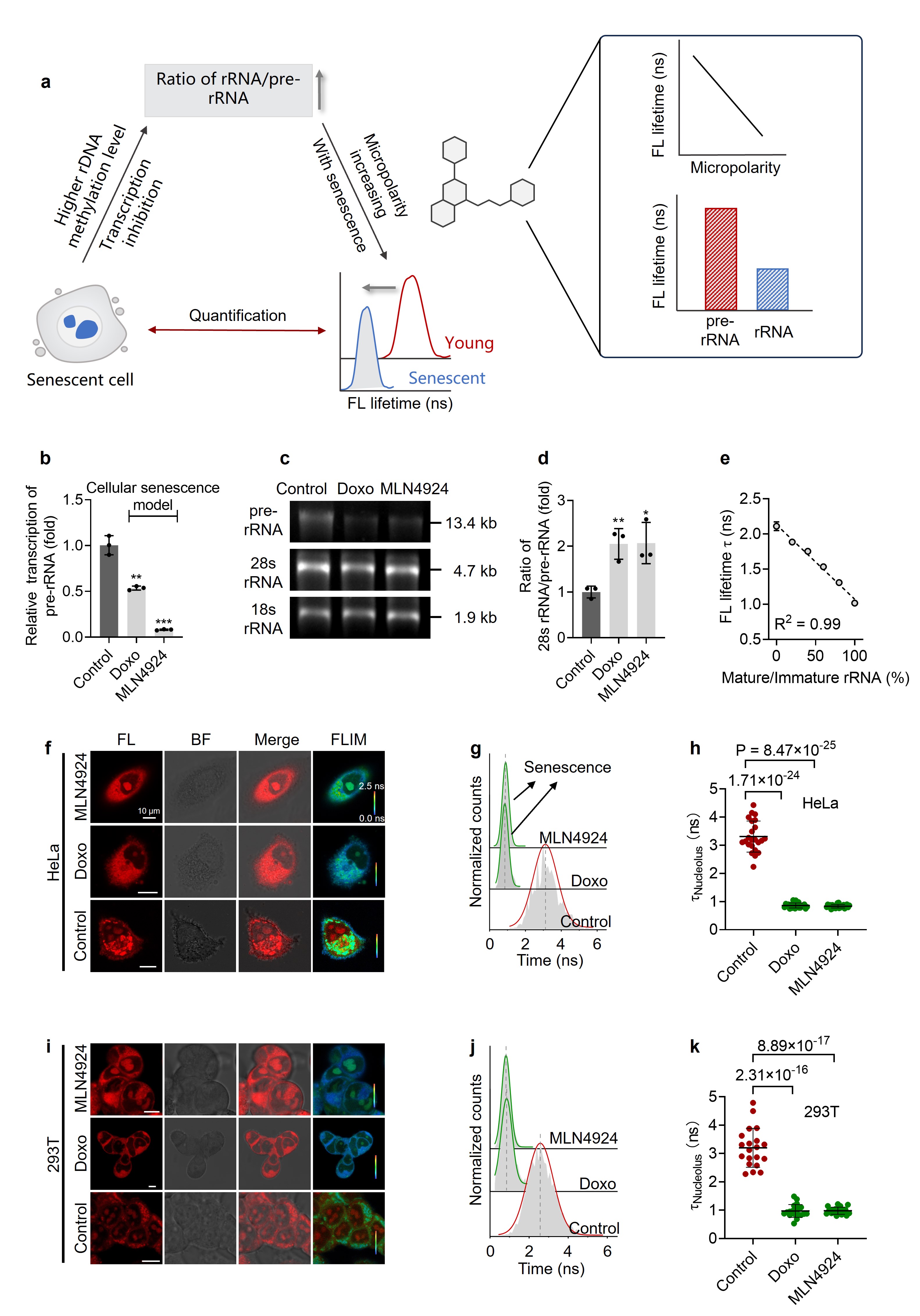 S-FLIM策略中,核心目标染料FLP1在结合rRNA后可产生高达410倍荧光增强,其荧光寿命与核仁微极性线性相关,能够直接反映细胞衰老状态。通过S-FLIM技术,实现了增殖细胞与衰老细胞的有效区分,并能够识别衰老的早期表型,为衰老生物学研究提供了高时空分辨、可视化的新型分析手段。