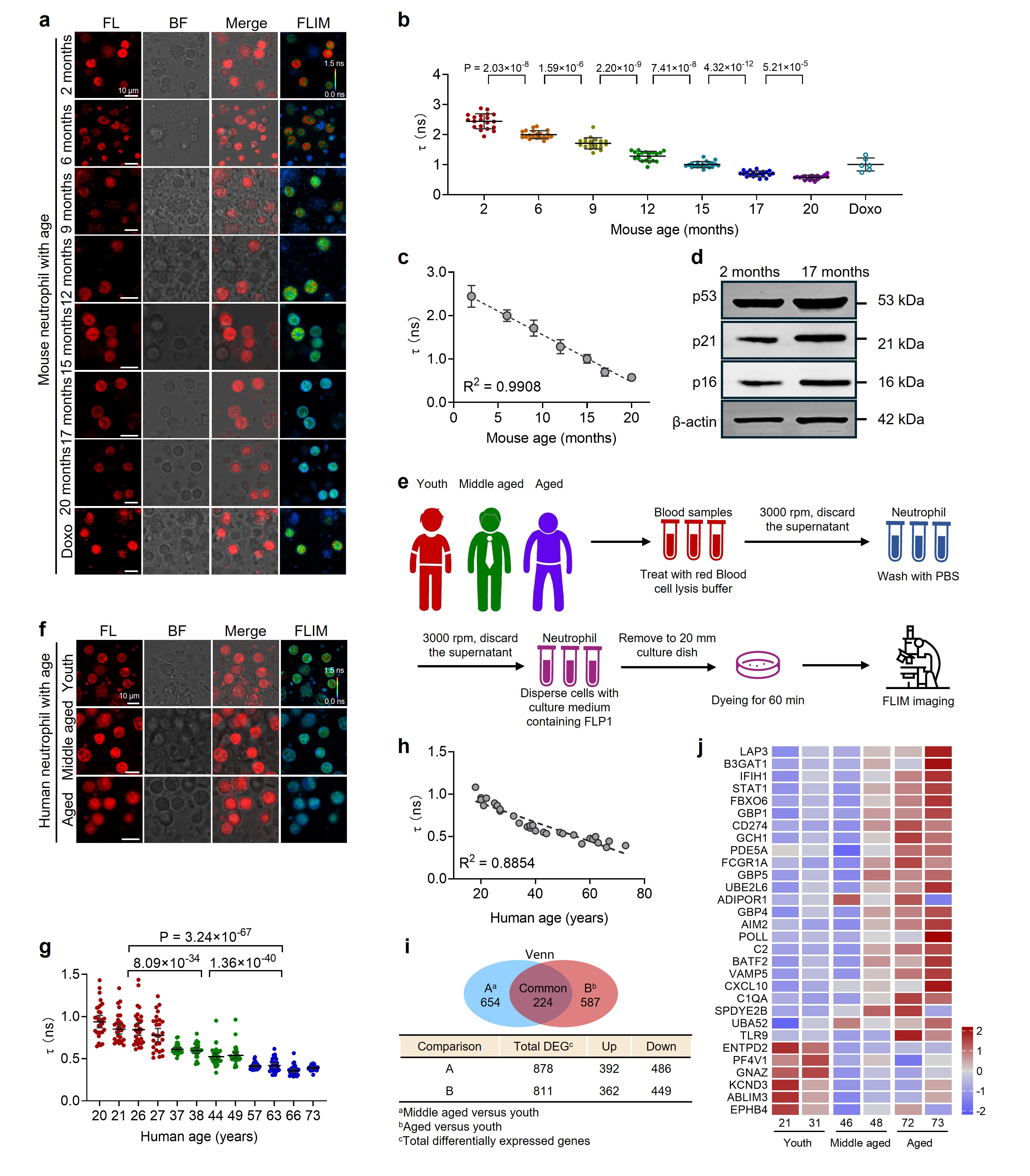 基于S-FLIM技术,研究团队成功建立了荧光寿命衰老时钟,并实现长寿个体鉴定:小鼠实验中,FLP1荧光寿命随年龄增长线性下降,并在早衰模型中验证其高度敏感性。对于人类志愿者(18-73岁)血液样本的测试数据显示,中性粒细胞荧光寿命与年龄高度相关,且与转录组学和DNA甲基化数据一致,体现了 S-FLIM 在跨物种衰老量化研究中的可靠性。在模式生物线虫中,S-FLIM实现了活体中实时衰老监测。长寿突变体daf-2的荧光寿命衰减斜率显著缓于野生型,19日龄daf-2线虫的核仁荧光寿命相当于野生型7日龄水平,直观可视化揭示了长寿表型中衰老进程的动态延缓。这些研究结果表明,荧光寿命衰老时钟能够跨物种、动态、定量地反映衰老状态,为衰老生物学研究及长寿机制解析提供了强有力的工具。