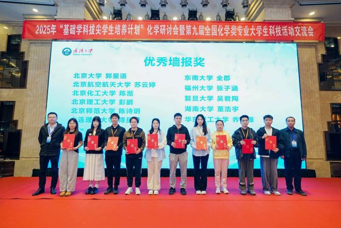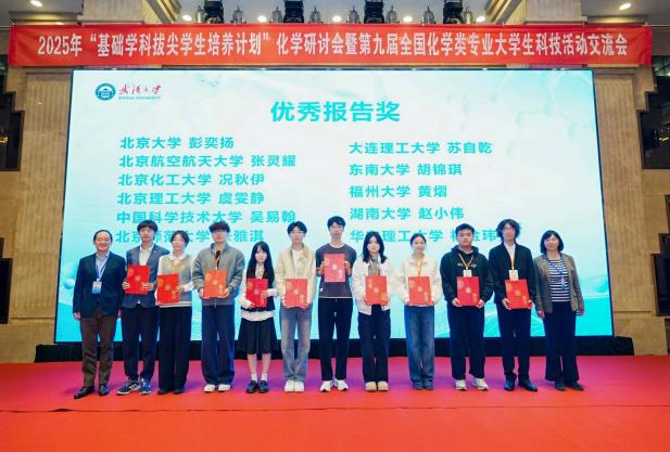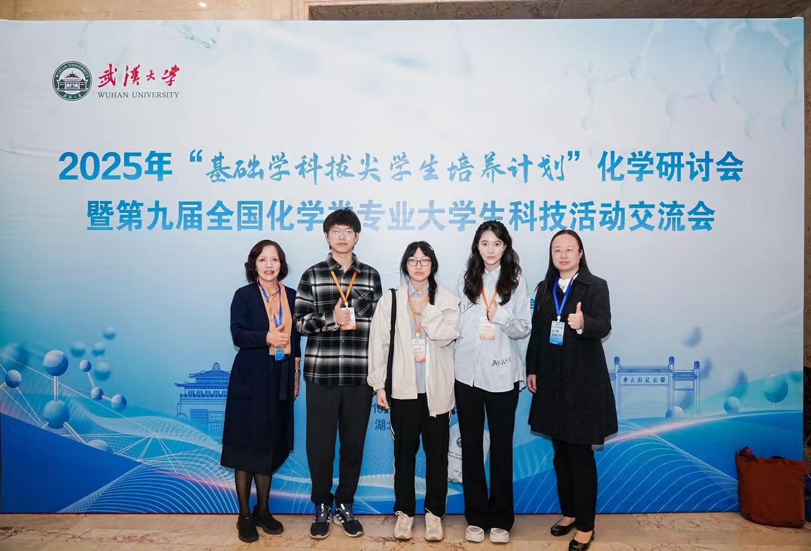 10月31日至11月3日,由教育部高等学校化学类专业教学指导委员会主办、武汉大学化学与分子科学学院承办的2025年“基础学科拔尖学生培养计划”化学研讨会暨第九届全国化学类专业大学生科技活动交流会在武汉举行。来自清华大学、北京大学、复旦大学等全国60余所高校的200余名师生齐聚珞珈山,共话基础学科拔尖人才培养新模式。我校化学与分子工程学院原副院长徐首红教授、化学拔尖学生基地秘书宋小瑜老师带领4名2023级化学拔尖基地学生代表参会,收获“优秀报告奖”“优秀墙报奖”各一项,实现奖项“大满贯”。
