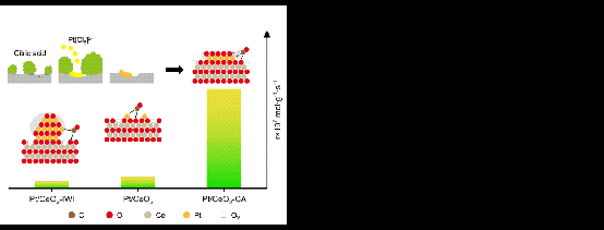 在环境治理和能源利用过程中,一氧化碳(CO)氧化是极为关键的基础反应。然而,在低温条件下实现高效且稳定的CO 转化一直是贵金属催化剂研究的难点。本研究创新性发展了柠檬酸辅助静电吸附(CA-SEA)策略,通过调控贵金属前驱体与柠檬酸分子的竞争吸附,在CeO2载体表面成功构筑出结构均一、二维“筏状”结构PtOx,其独特结构显著改善了PtOx电子性质,使得PtOx筏上CO吸附性能显著优于Pt单原子或PtOx团簇结构,随后吸附CO与PtOx筏和CeO2表面的O*物种反应,使得PtOx筏状催化剂的T50(50%CO转化温度)比Pt单原子和PtOx团簇的催化剂降低120°C以上,表现出极其优异的CO低温氧化活性和稳定性。