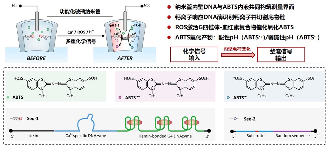 课题组研究人员设计了一种基于化学门控人工纳米通道的动态测量新策略,通过在玻璃纳米管内表面修饰DNA功能结构来实现跨膜通道的整流性质转换。DNA链的空间结构和电荷可通过多种关键化学信号进行智能调节。Seq-1包含用于纳米管内壁附着的连接部分(Linker)、钙离子响应DNA酶(CD)、G四链体-血红素复合物(HG4)三部分,Seq-2包含与Seq-1中CD部分对应的底物(Substrate)以及一段随机DNA序列(RD)两部分。CD和Substrate序列互补,Seq-1和Seq-2在纳米管内壁形成Seq-1/Seq-2二聚体(dsDNA)。用含ABTS,即2, 2’-联氮-双(3-乙基苯并噻唑啉-6-磺酸)的电解质溶液填充玻璃纳米管,建立多重化学信号响应的测量界面。Ca2+激活CD切割底物,导致Seq-2的3’端片段脱落。HG4可以催化ROS介导的ABTS氧化,在酸性pH下生成ABTS•+或在中性/弱碱性pH下氧化为ABTS•-。Ca2+触发的底物裂解以及HG4催化氧化ABTS引起纳米管内壁电荷变化,通过离子电流整流(ICR)进行实时监测。