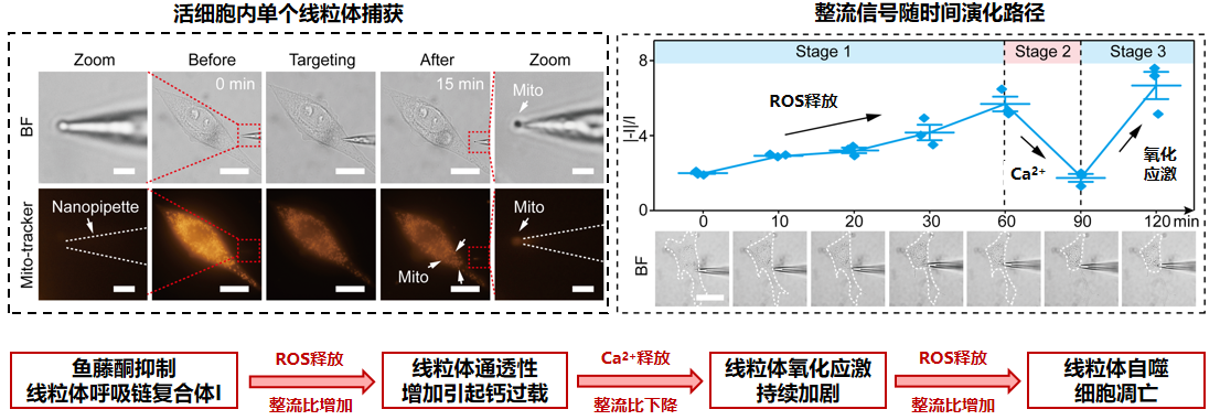 研究人员实现了在单个活细胞中对单个线粒体的靶向捕获,对线粒体多种信号(Ca2+ / ROS / H+)的时序性释放进行原位响应,实现了鱼藤酮刺激下单个线粒体内源性化学信号的原位时序性响应测量。尽管细胞内环境复杂,但人工纳米通道仍能在局部亚细胞区域对复杂的化学信号进行测量。