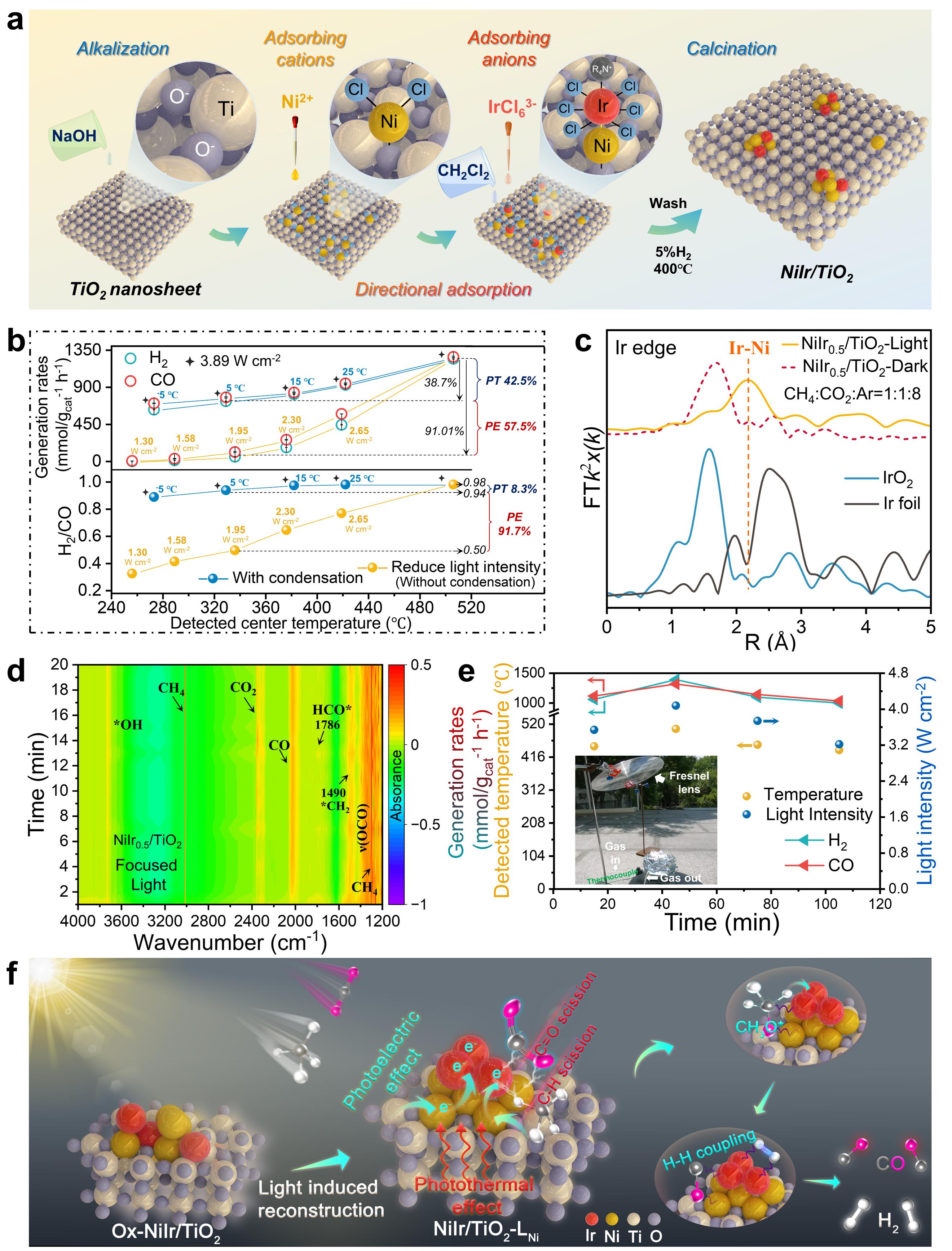 基于上述背景,团队成员运用定向吸附策略(图a)在TiO2载体上构建了具有原子配位的双金属NiIr纳米团簇。该催化剂展现出10841 mmol gcat-1 h-1的合成气生成速率,光热燃料转化效率高达25.0%,转化频率达23 s-1。研究表明,光电效应在该体系中起到主导作用(图b),对合成气生成速率的贡献为57.5%,对产物比例平衡的贡献为91.7%。原位谱学研究(图c-d)表明,NiIr双金团簇在光诱导下产生的界面电荷振荡可触发动态结构重构,形成由氧化镍键合稳定的TiO2负载的NiIr纳米岛合金结构。该结构演变源于光激发下TiO2-Ni-Ir界面间的强电子转移过程。这种空间与电子协同的构型在光驱动DRM反应中加速了H-H偶联,并促进了CHxO*中间体生成,该反应路径有效抑制了碳沉积。此外,该催化体系在室外聚焦的太阳光下(图e)实现了与实验室条件相当的合成气生成速率,这为发展自然太阳光催化温室气体转化提供了技术支撑。