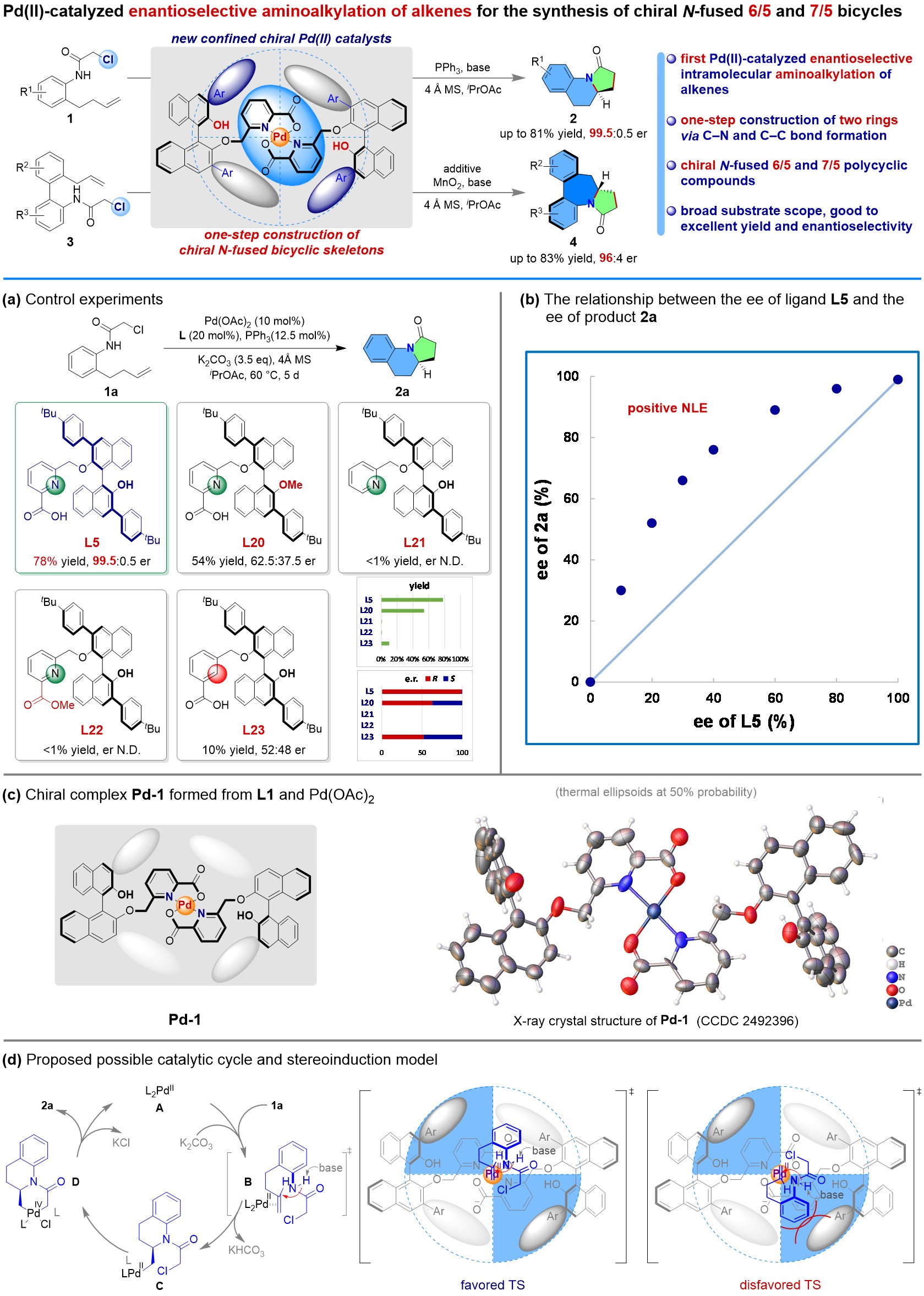 我校张志鹏教授/岑守义老师团队以不对称催化和手性分子的合成为主要研究方向,长期致力于新型原创性手性催化剂的设计、发展和应用研究。为了发展高效合成含有手性N-稠合6/5和7/5双环骨架的多环化合物的新方法,该团队设计发展了一种新型的具有紧密手性环境的二价钯催化剂,该催化剂由两个含有联萘结构的轴手性吡啶甲酸配体与一个二价钯离子配位形成,利用该催化剂首次实现了非活化烯烃的对映选择性分子内胺化烷基化反应,通过一步反应同时构建了C−N键和C−C键,以中等至良好的收率和优异的对映体选择性(高达99.5:0.5 er)成功合成了多种含有手性N-稠合6/5或7/5双环骨架的多环化合物。该工作不仅为相关的N-稠合多环化合物的合成提供了一种有效的方法,也对新手性催化剂的设计发展有一定的启示作用。