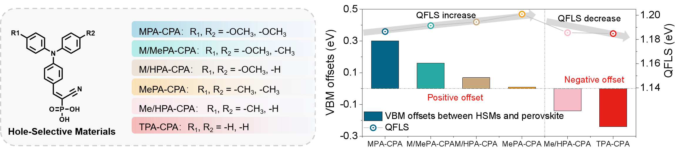 图1. 空穴选择性材料的末端基团调控界面能级排布