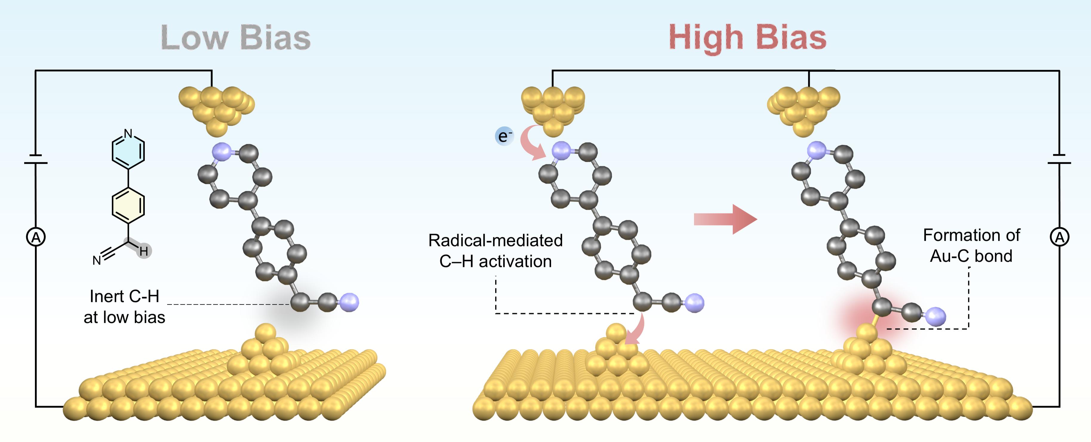 传统C–H键活化通常依赖导向基团或化学氧化剂,步骤繁琐且条件苛刻。针对这一挑战,研究团队提出了一种基于外加偏压驱动化学反应的全新策略,结合扫描隧道显微镜断裂结(STM-BJ)技术,首次通过偏压调控实现了苄位C–H键的原位活化及Au–C共价分子结的直接构筑。团队系统研究了不同分子结构对反应活性和电输运性质的影响,揭示了分子长度、锚定位点及电子效应对C–H键活性的关键调控作用,并证实该方法在苯乙腈衍生物体系中的普适性。