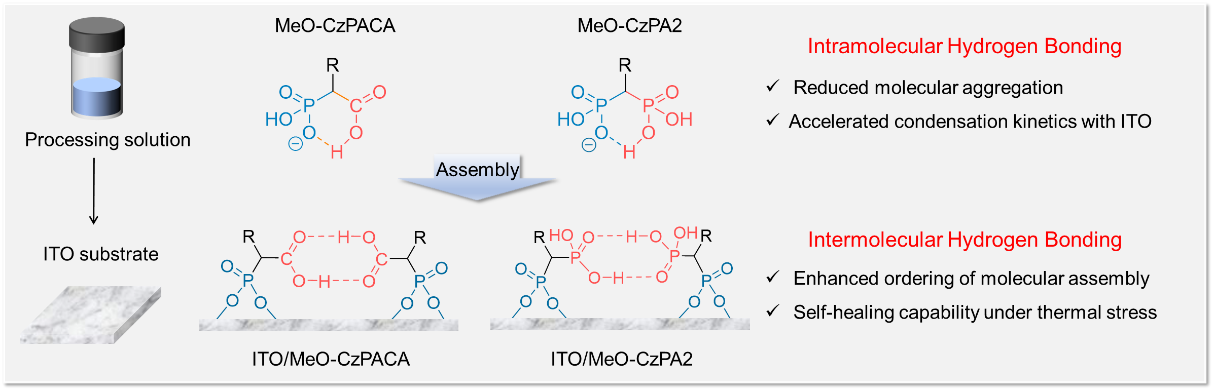 图片说明:加工溶液中分子内氢键与ITO表面分子间氢键之间的协同效应,使得锚定组装的空穴选择层同时具有高的组装密度和优异的组装稳定性