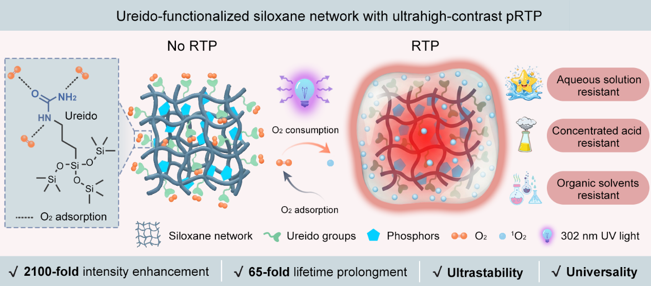 光激活室温磷光材料因其非侵入性、可逆性和颜色可调性,在信息加密、光学打印和生物医学等领域具有广阔应用前景。然而,传统光激活聚合物主体基质,如聚乙烯醇(PVA)和聚甲基丙烯酸甲酯(PMMA),主要依赖被动的氧气渗透,导致光激活效率低、对比度有限,同时聚合物基质在水、有机溶剂或强酸等苛刻环境中稳定性差,严重制约了其适用范围。