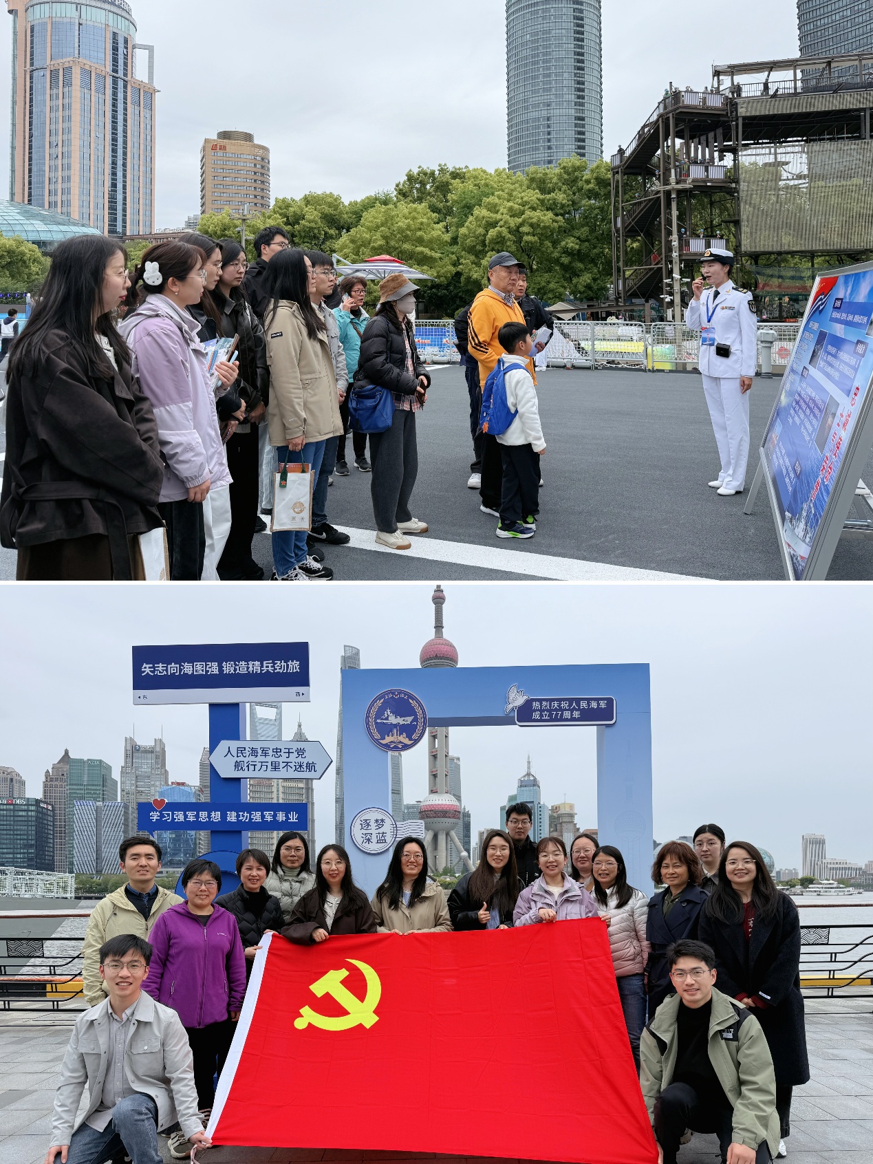 为庆祝中国人民解放军海军成立77周年,深化国防教育,厚植家国情怀,4月23日,化学学院组织党员教师代表赴国客中心码头参加“上海·海上”海军舰艇开放日活动,零距离领略人民海军的卓越风采,沉浸式感受深蓝卫士的使命担当。